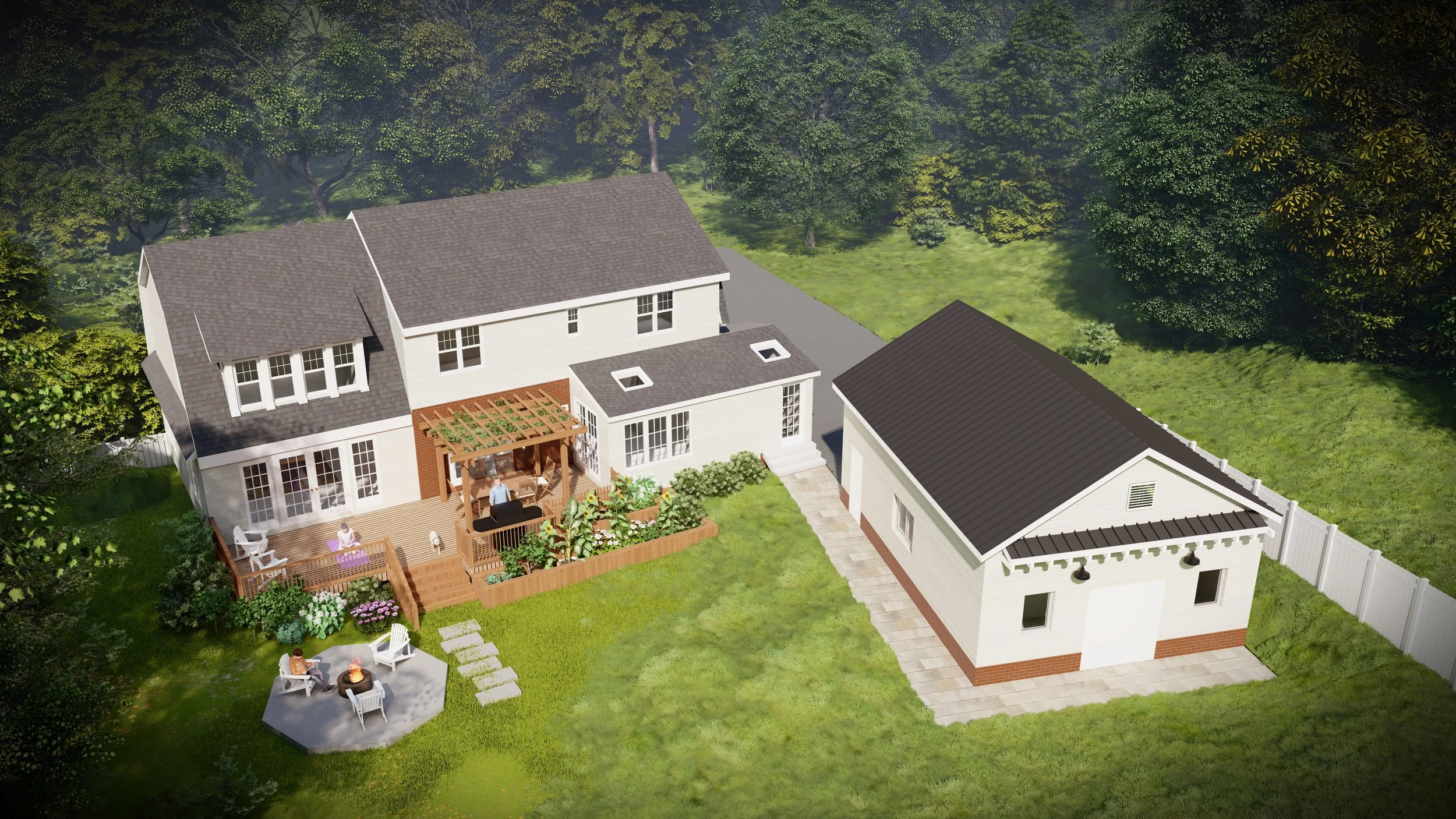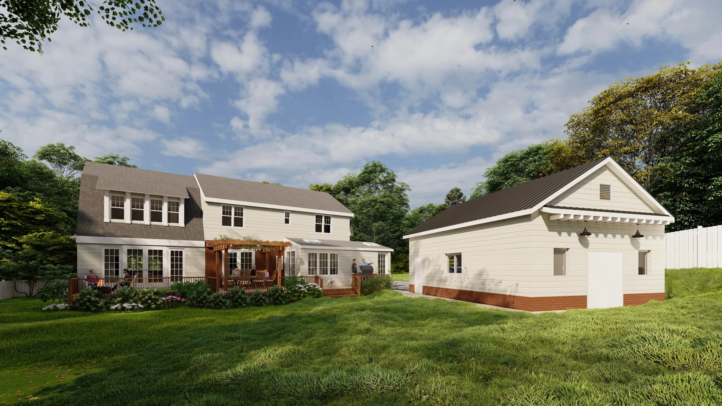 This is an example of a multi-phased, robust renovation design package. There are four different renovation projects involved in this package. The first involves demolishing an dilapidated two-car garage and redesigning a new detached two-car garage with a loft and a room for storage. Second, the client requested several kitchen upgrades, including adding a new pantry and mudroom off of the existing kitchen. An existing screened-in porch is to be demolished and upgraded to new all-season sunroom. A nonconforming back deck is to be redesigned to be safer and more family-friendly.