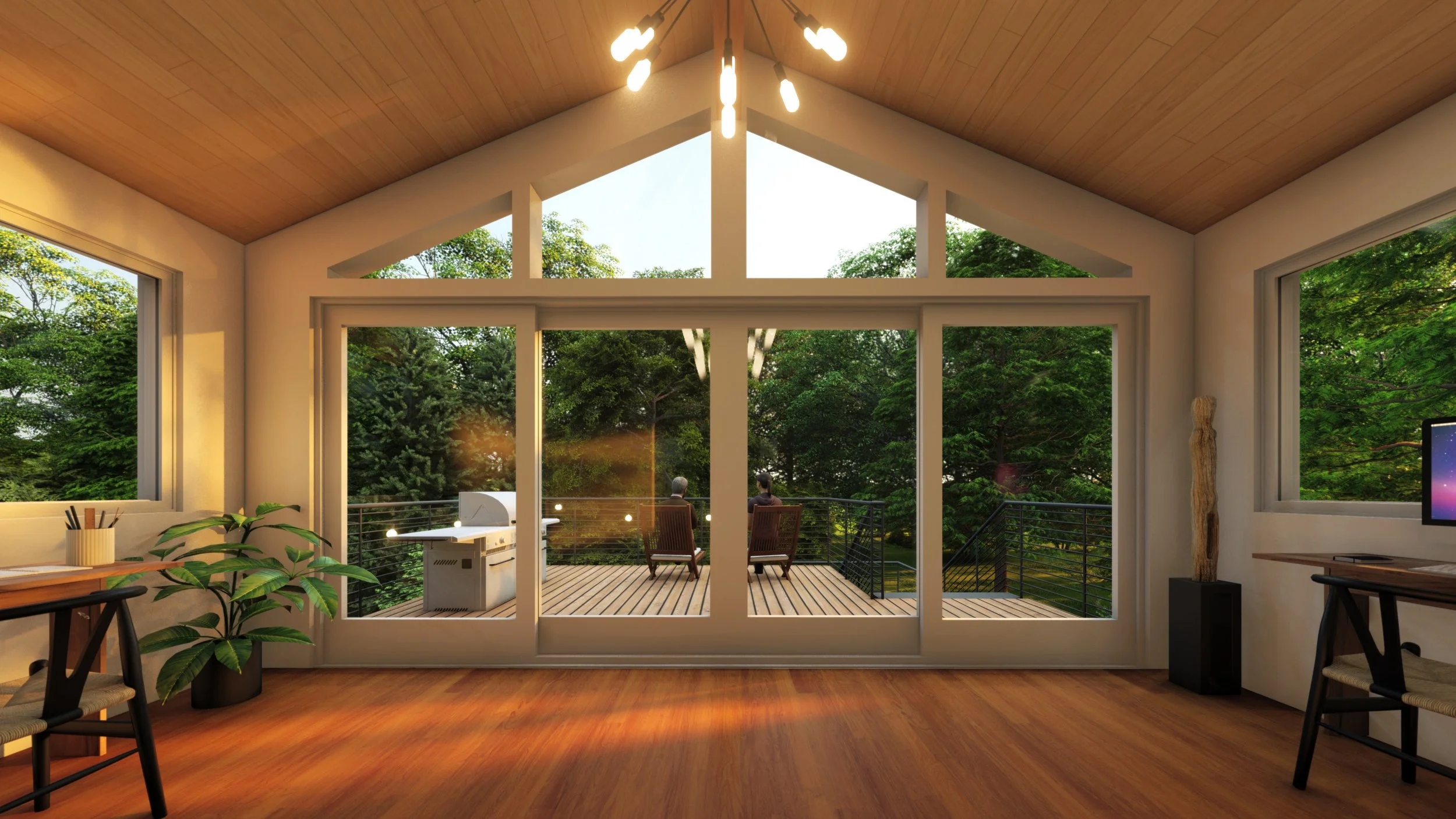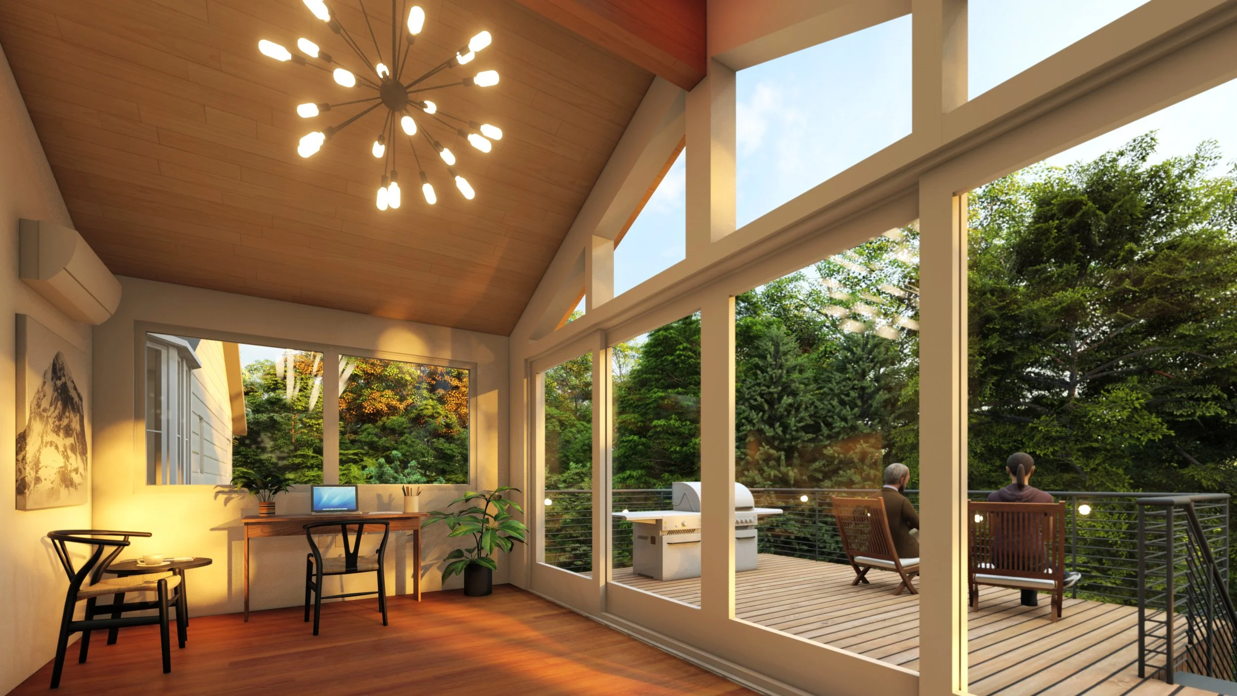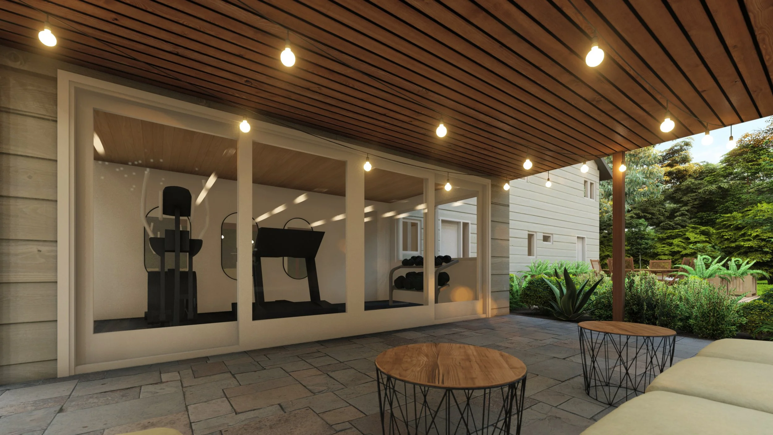 This was a two story renovation project that included a new deck, gym, sunroom, and office space off of an existing two-story single family home in Chestnut Hill, just outside of Boston. This began with a building code and zoning analysis to ensure compliance with local zoning ordinances, moved into a schematic design phase where we drafted and modelled the home’s existing conditions and created realistic 3D visual rendering, and ended with construction documents suited for the approval of a long-form building permit. We worked with the land surveyor, structural engineer, and the contractor throughout the design process.